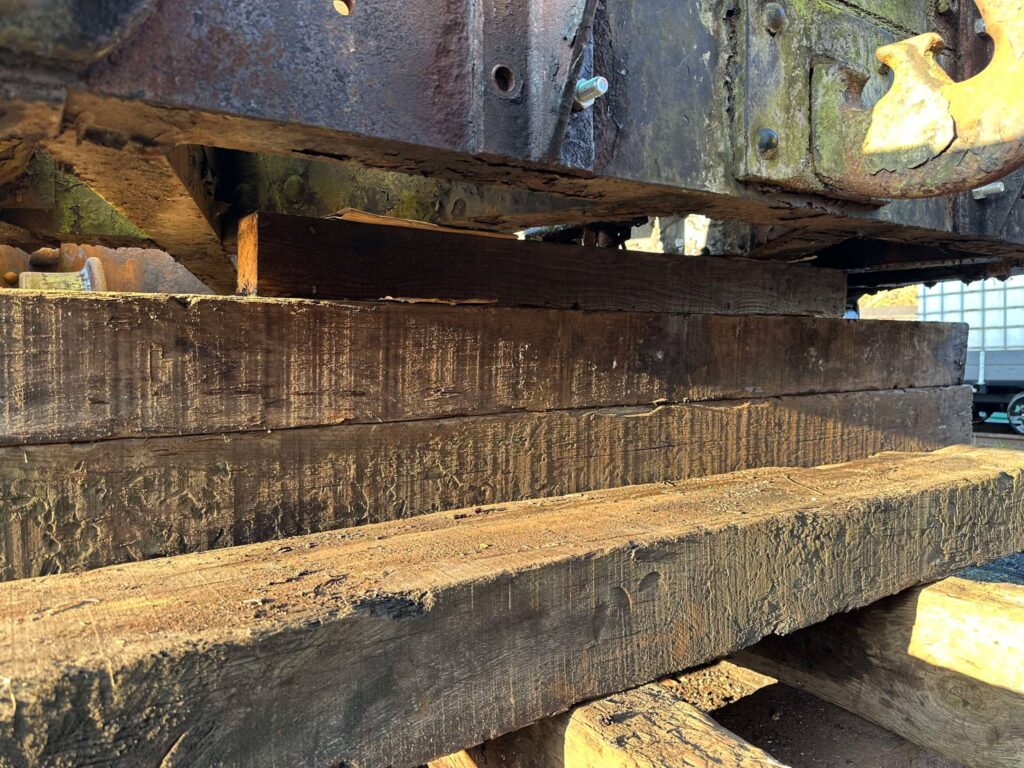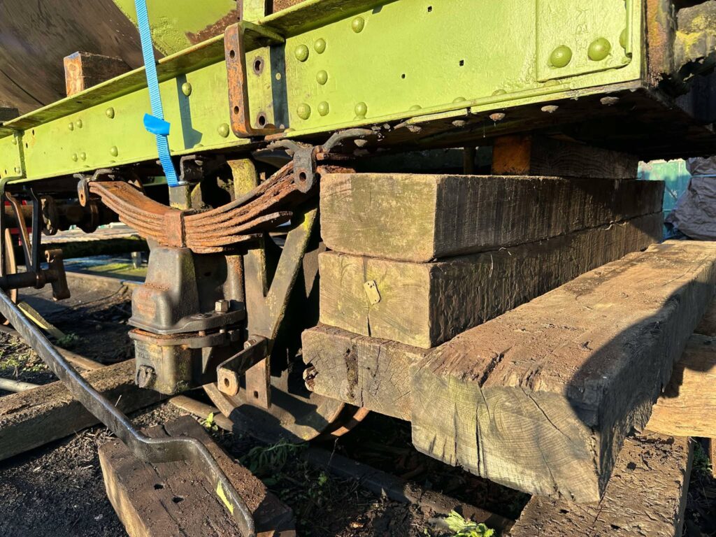 Here is another angle from below. We will use the 2 diagonal parts of the chassis to lift from and spread the weight equally. Once the problem spring is removed, the wagon will rest on the sleepers until repairs are complete.